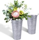 lnch Galvanized Metal Vases with Handles – 2 Pcs Farmhouse Decorative Metal Container for Flowers, Rustic Metal Bucket Planters for Wedding Decor (Silver)