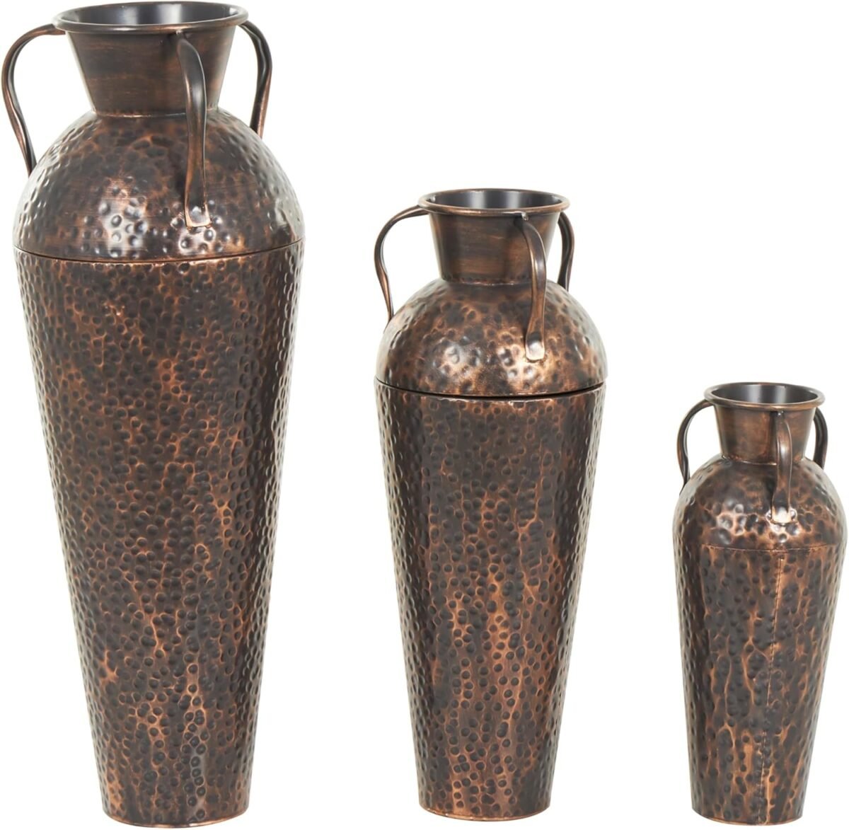 Metal Decorative Vase Tall Floor Weathered Amphora Centerpiece Vases with Hammered Details and Handles, Set of 3 Vases for Home Decoration 33″, 25″, 18″ H, Copper
